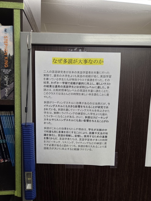 その内容が「なぜ多読が大事なのか」を非常によくまとめていたので、教室に掲示して生徒のモチベーション向上に役立てています。